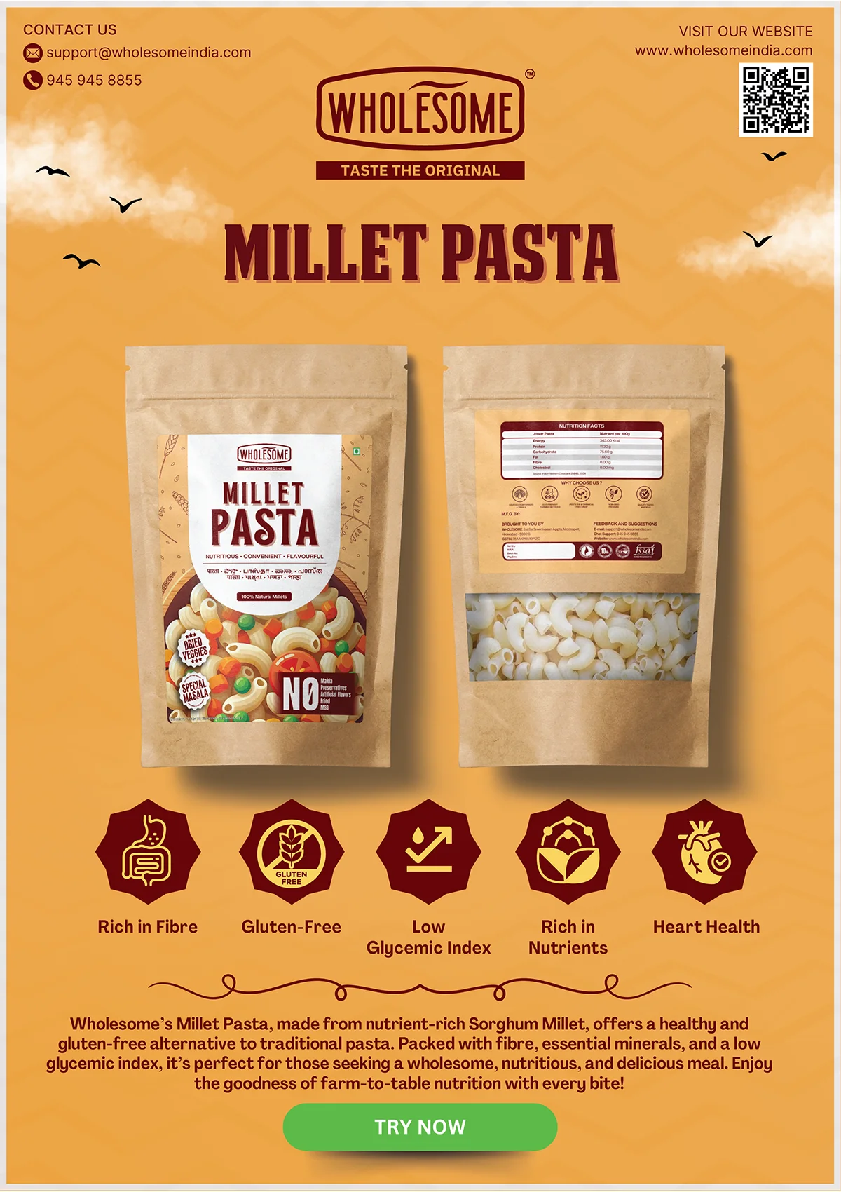 Wholesome’s sorghum millet pasta is a nutritious, maida-free option, rich in fibre and essential nutrients. It’s a healthy alternative to regular pasta, offering a delicious way to enjoy your favourite dishes while staying true to Wholesome’s “Taste the Original” philosophy.